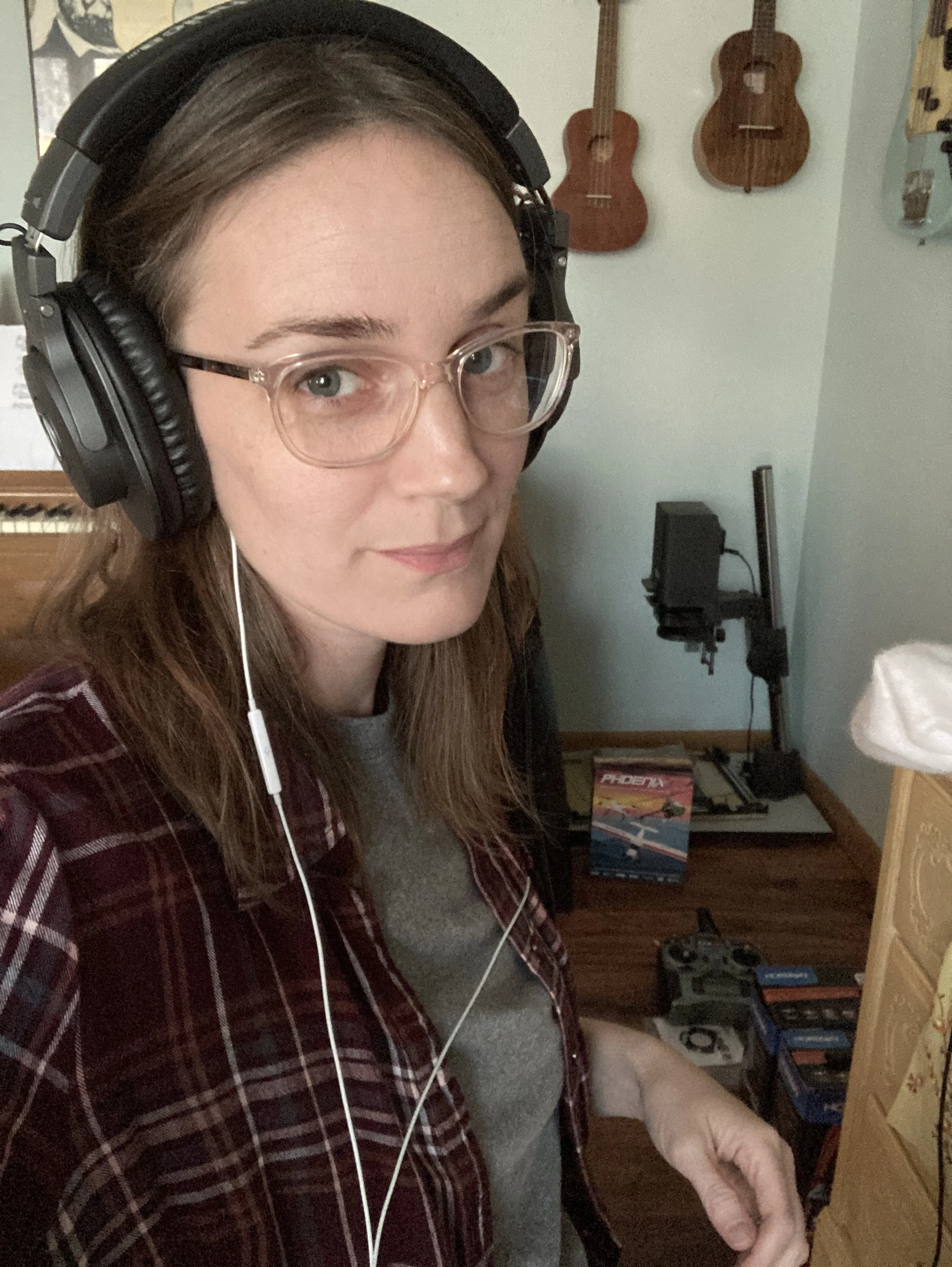 double headphones; she must mean business